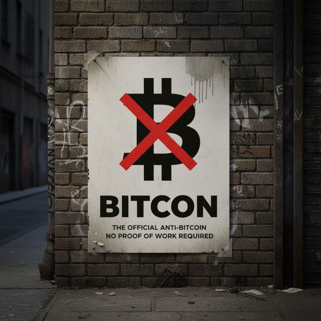Bitcon is satirical, anti-Bitcoin token that flips the script on traditional mining culture by requiring no proof of work, no expensive rigs, and no energy waste to participate. Instead of rewarding those who burn the most electricity, Bitcon is designed as a low-friction, community-first asset that anyone can hold, trade, or meme without needing to solve a single hash. It exists to poke fun at the seriousness and gatekeeping of legacy proof-of-work systems. By design, Bitcon shifts the focus from hash rate and hardware to creativity, culture, and participation.